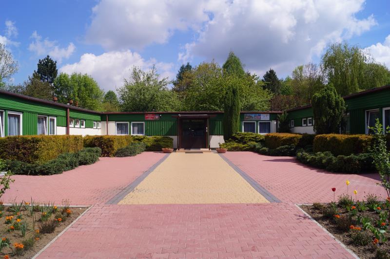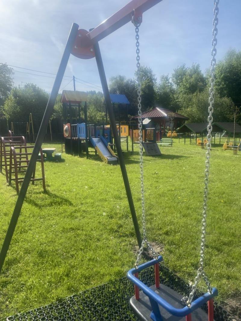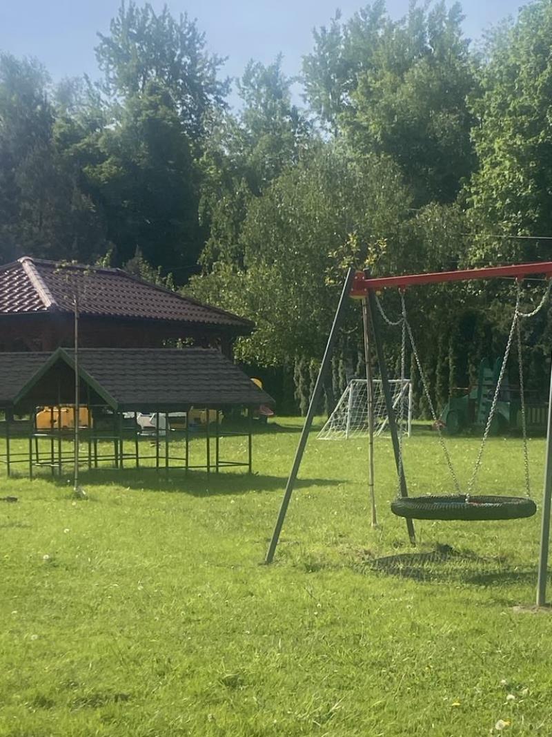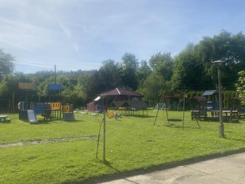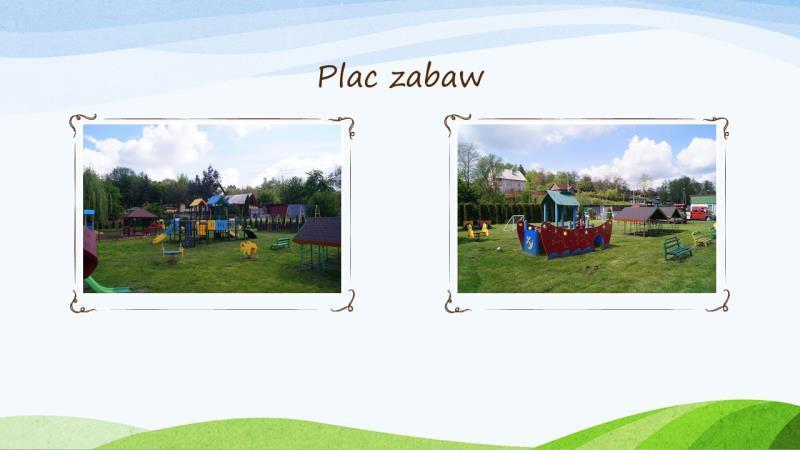 - duży, zielony plac zabaw, gdzie dzieci korzystają ze swobodnej zabawy, zadaszona, duża piaskownica,